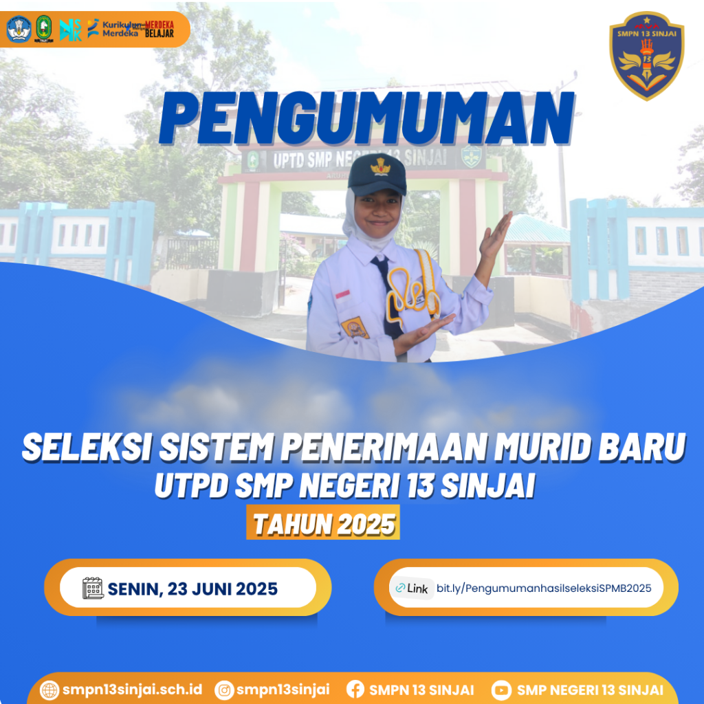 Dengan ini diumumkan bahwa hasil seleksi Penerimaan Peserta Didik Baru (SPMB) Tahun Pelajaran 2025/2026 di UPTD SMP Negeri 13 Sinjai dapat dilihat mulai: